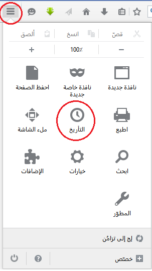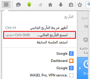 (أو يمكنك أن تضغط Ctrl+Shift+Delete"" لفتح قائمة حذف التأريخ وتخطي الخطوتين السابقتين)