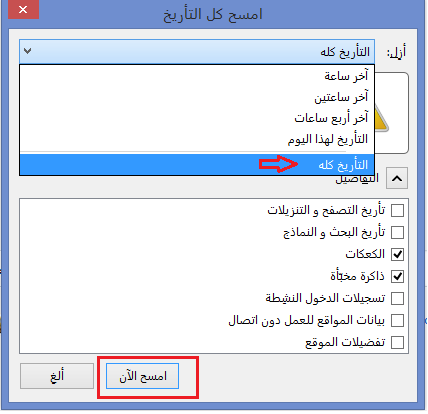 اضغط قائمة "التفاصيل" واختر "ذاكرة مخبأة" وقم بإزالة علامة الصواب من باقي الخيارات ثم اضغط "امسح الآن".