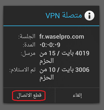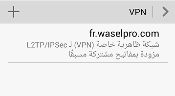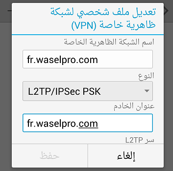 في حقل "اسم الشبكة الظاهرية الخاصة"، اكتب عنوان خادم واصل برو VPN الذي تود الاتصال به (مثال: fr.waselpro.com).
