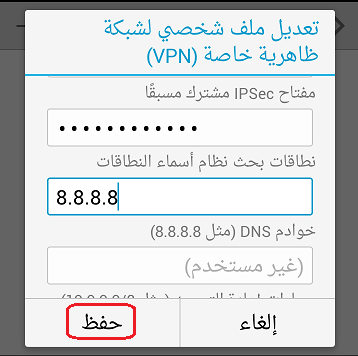 في حقل "نطاقات بحث نظام أسماء النطاقات"، اكتب 8.8.8.8 ثم اضغط "حفظ".