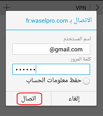 اكتب كلا من "اسم المستخدم" و"كلمة المرور" الخاصة بحساب واصل برو VPN الخاص بك. (يمكنك اختيار "حفظ معلومات الحساب" إذا كنت تفضل) ثم اضغط "اتصال".
