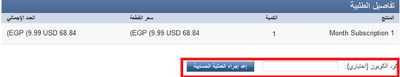 قم بنسخ الكود المرسل إليك في المكان المخصص له أعلى الصفحة ثم اضغط زر "أعد إجراء العملية الحسابية" ليتم احتساب خصم بقيمة 20% من قيمة مبلغ الاشتراك