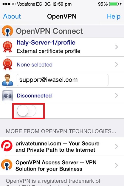 Slide the VPN "On" button to connect. (You can find it below "disconnected")